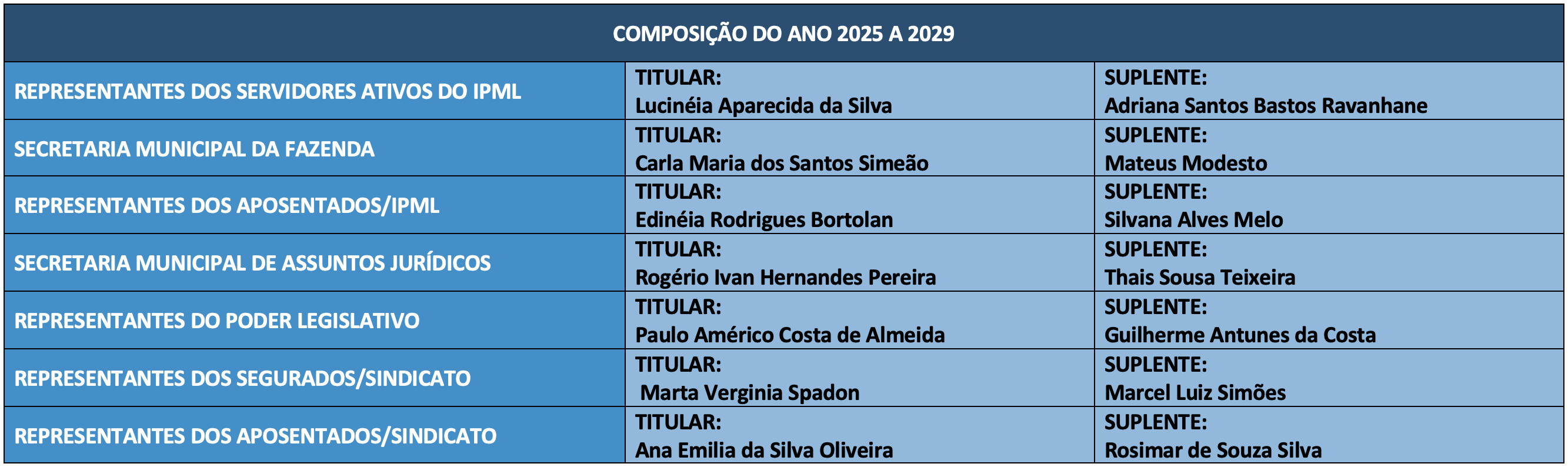 Reuniões: toda terceira quinta-feira do mês, 13h30min na sede do IPML. Quando há necessidade são realizadas reuniões extraordinárias.