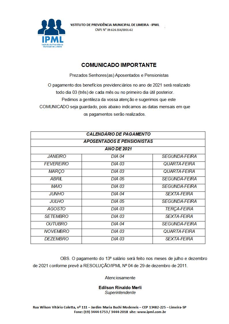 Prezados Senhores(as) Aposentados e Pensionistas, o pagamento dos benefícios previdenciários no ano de 2021 será realizado todo dia 03 (três) de cada mês ou no primeiro dia útil posterior. Pedimos a gentileza da vossa atenção e sugerimos que este comunicado seja guardado.