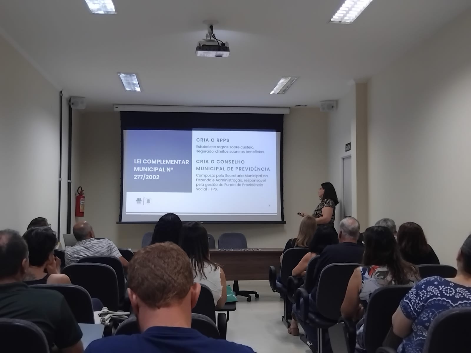 Durante a reunião, Aline abordou sobre a criação do Regime Próprio de Previdência Social (RPPS), instituído pela Lei 277/2002, que extinguiu o Regime Obrigatório de Pensão Mensal. Destacou ainda a instituição da Autarquia que se deu por meio da Lei Complementar nº 400/2007, além das alterações nas legislações que regulamentam o sistema previdenciário municipal.
